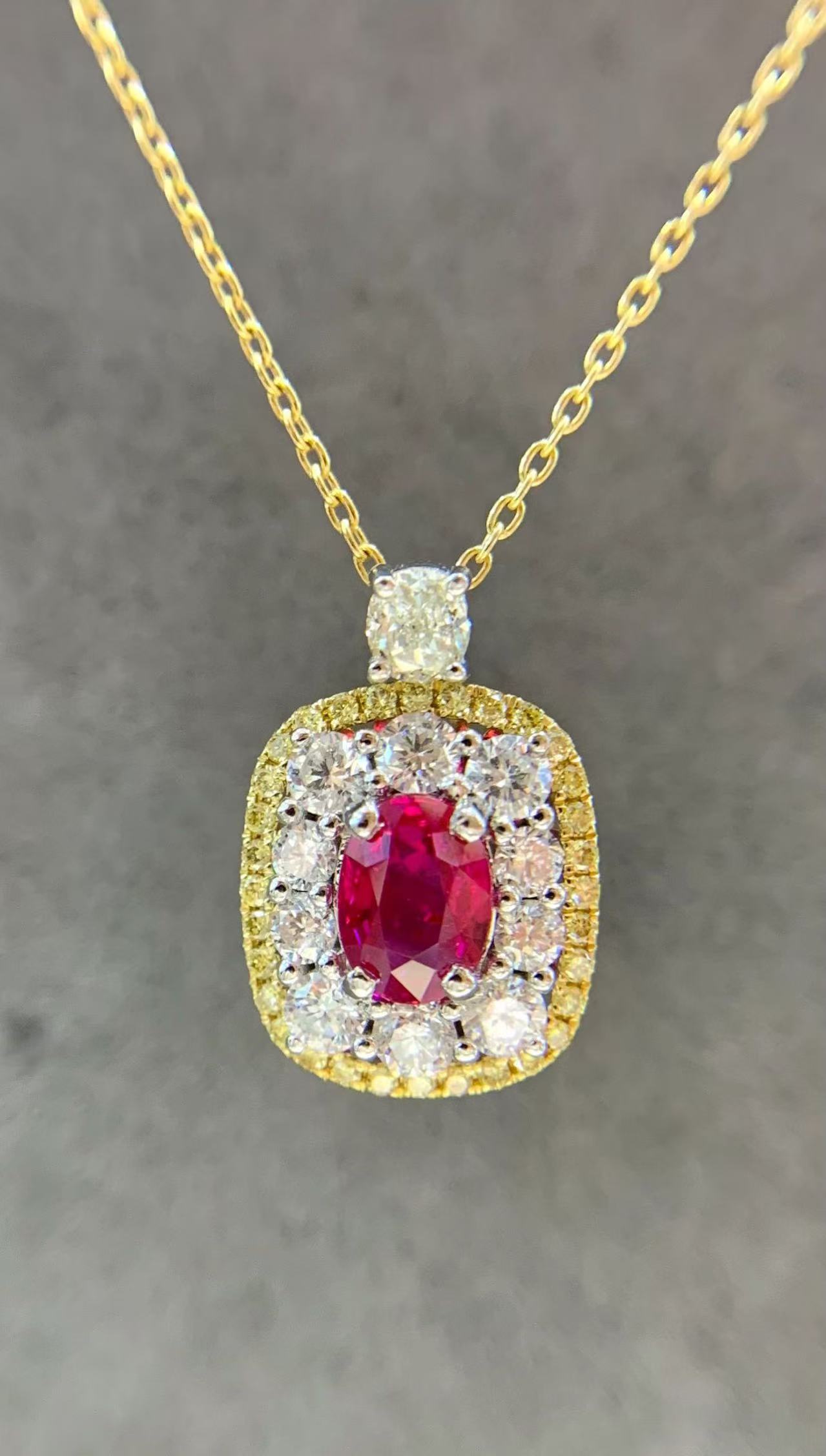 This 18K gold pendant features an oval pigeon-blood ruby as its centerpiece, surrounded by brilliant-cut diamonds. A single diamond at the top connects to the chain. The ruby is vivid and eye-catching. The diamonds, with their pure and flawless color, complement the delicate texture of the gold base, blending classical beauty with exquisite craftsmanship. When worn, it exudes luxury and elegance, sparkling brilliantly in every move.