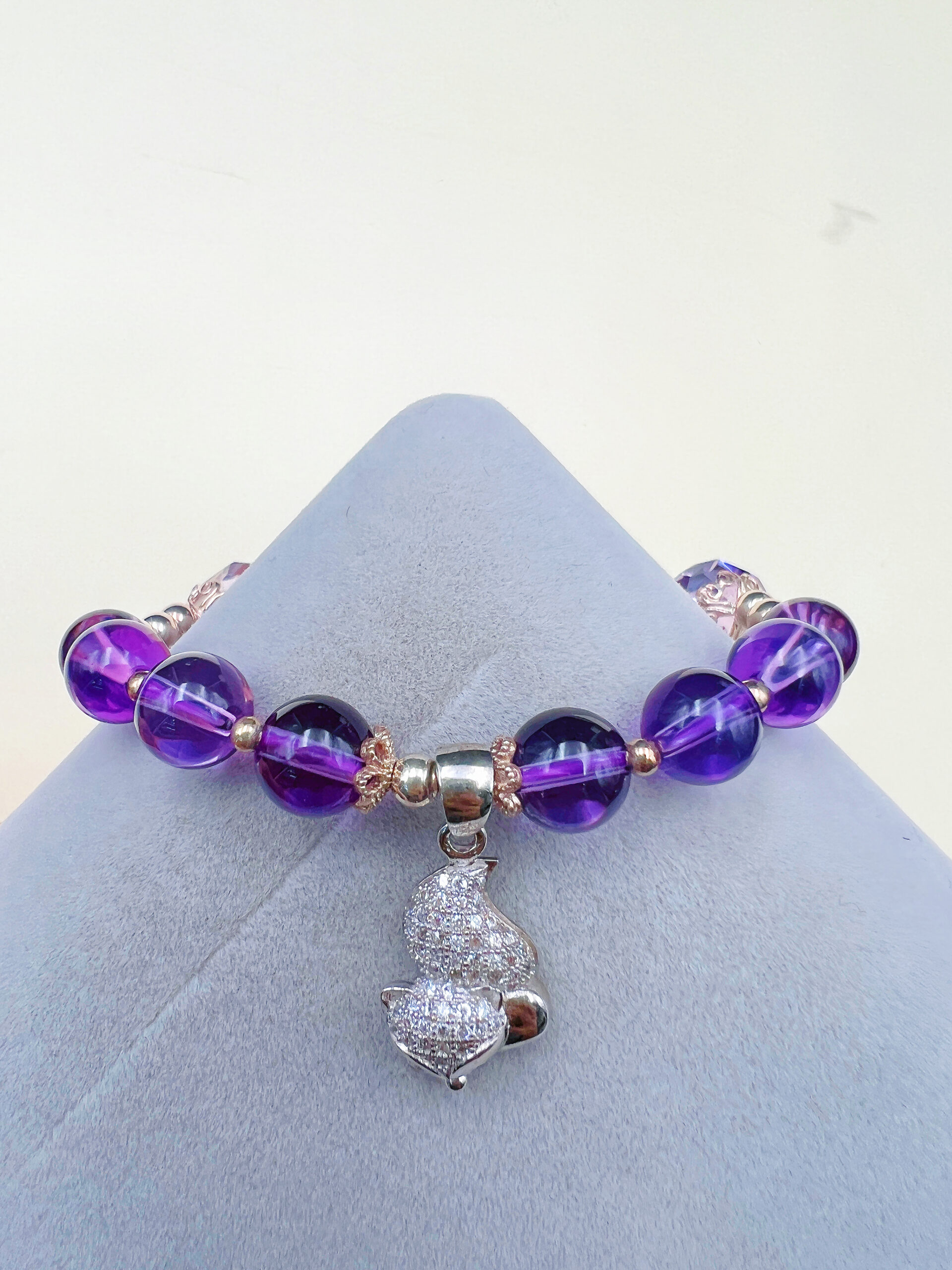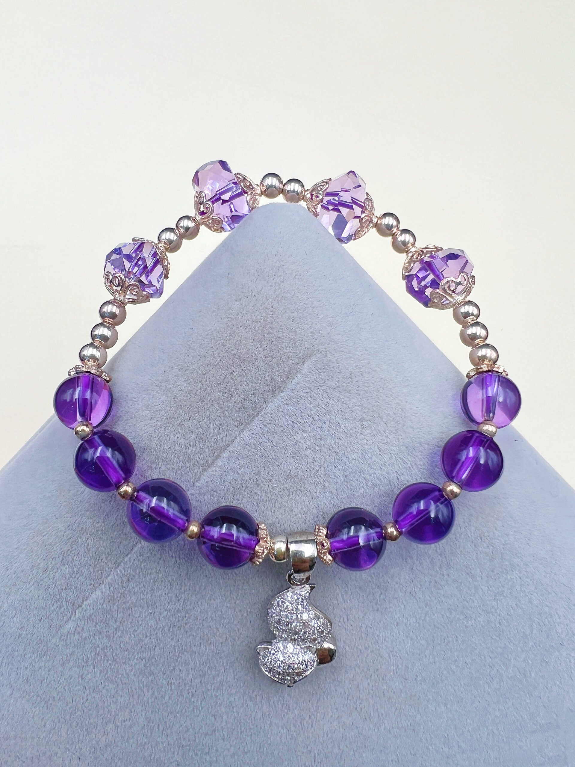 The harmonious blend of amethyst round beads with irregularly cut amethyst shapes enriches the bracelet with a unique design and artistic flair, creating a more exquisite piece.